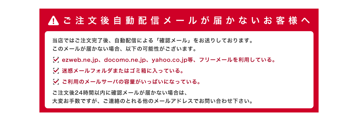 新規ご登録やご注文の際に、当ショップからの自動返信メール・ご注文完了メールが届かない事例が発生しております。ドコモ等の携帯電話のアドレス、Yahoo等のフリーアドレスをご利用で、特にスマートフォンをご利用のお客様で、自動返信メールが届かない場合は、@shiogamagasweb.shopからのメールが受信できるよう、受信設定の確認をお願いいたします。設定の確認方法につきましては、ご利用の携帯電話会社様等にお問合せください。また、迷惑メールフォルダもご確認くださいますようお願いいたします。