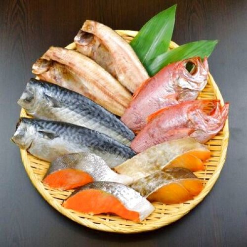 【内容量】さば半身干し2枚×1、さば半身醤油干し2枚×1、金目鯛半身干し2枚×1、赤魚醤油半身干し2枚×1、真ほっけ半身干し2枚×1、紅鮭寒風干し2枚×1