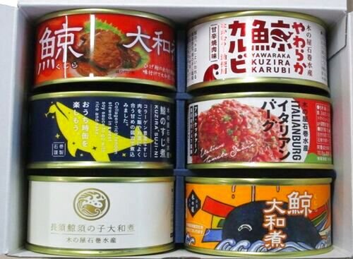 ひげ鯨大和煮(170g)、やわらか鯨カルビ(150g)、鯨のすじ煮(150g)、秋冬さば味噌煮(170g)、まぐろ尾肉大和煮(170g)、漁師街のぶり大根(170g)、サラダさばあっさり塩味(170g)、いわし醤油味付け(170g)、銀鮭の中骨水煮(180g)
